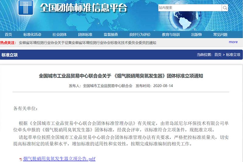 全國城市工業(yè)品貿(mào)易中心聯(lián)合會關于《煙氣脫硝用臭氧發(fā)生器》團體標準立項通知